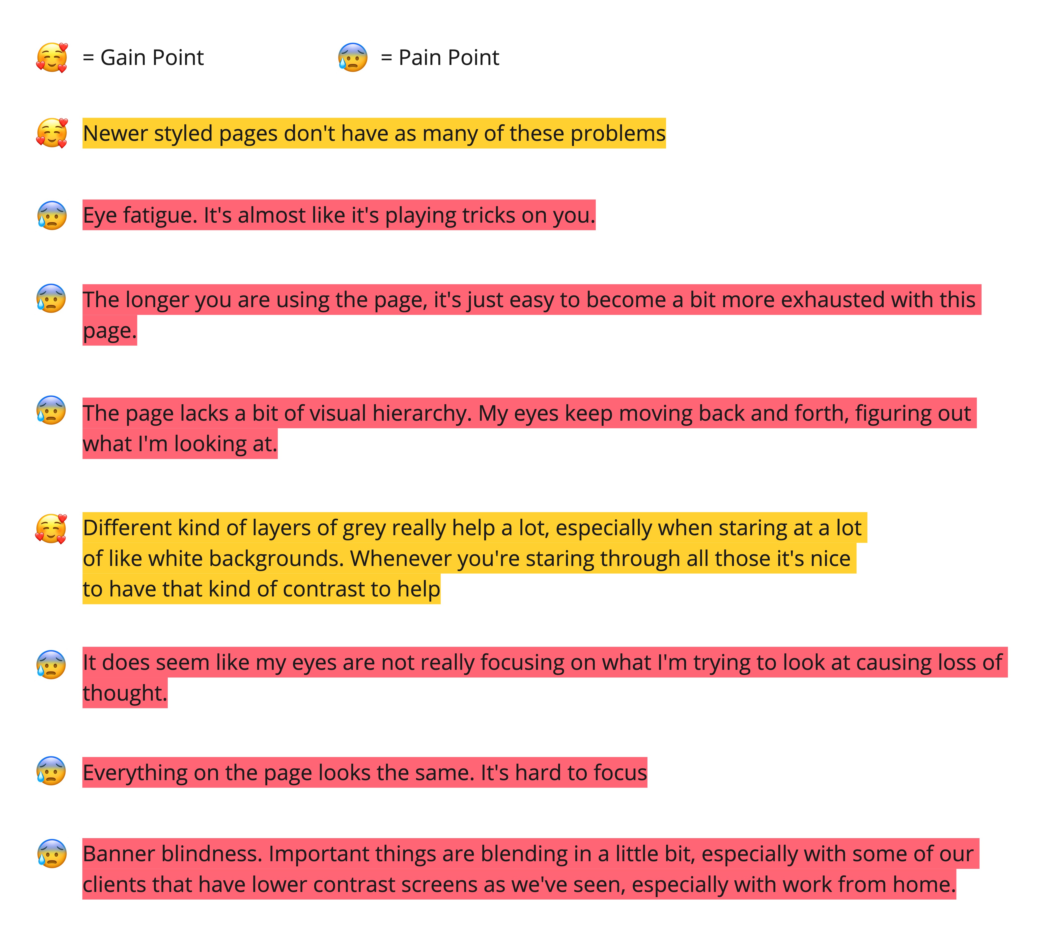 With each interview, I noted comments as positive feedback/ideas or as stressors. Many of the stressors pointed to lack of visual hierarchy due to color and layout issues. I reported my findings to the rest of the Product Team and we were able to bring greater focus to designing with more intentional and meaningful layouts.