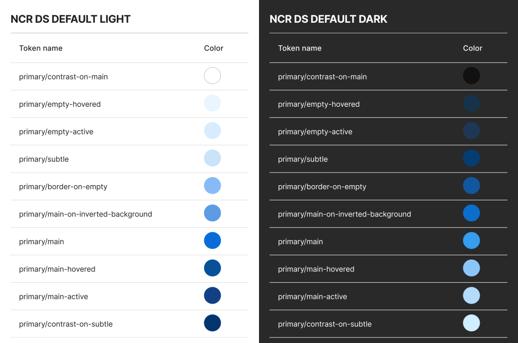 Rather than continuously maintaining separate library files at NCR, where one contains light themed components and another contains dark themed components, we renamed our color tokens to leverage Figma’s theme swapping function.