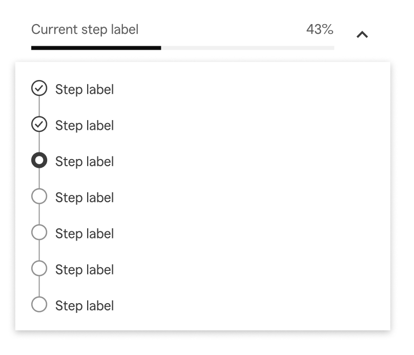 As the designer changes the #-of-steps, multiple things in the component change. The label “Step # of #” updates based on the number of steps chosen as well as the active step. When type: % is chosen, the label turns to the appropriate percentage. The progress bar also updates accordingly along with the status of the completed and in progress steps.