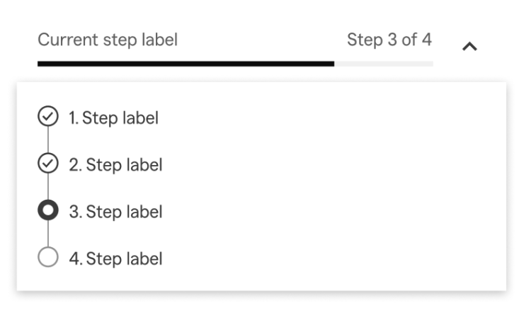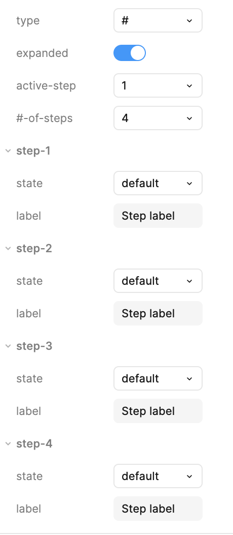 The progress-stepper component is built with nested subcomponents to simplify the configuration options for the designer. The nested subcomponents are mostly helpful for building and updating the component from the design system perspective.